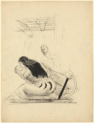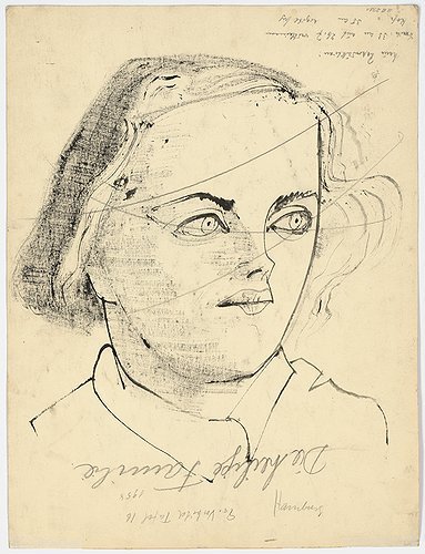 Frauenkopf nach rechts (durchstrichen), Pinselzeichnung, gleiche Zeit. Bez.: Die heilige Familie. Bez. von Johanna Hegenbarth: Ew Vorbild Tafel 16 1958. Bez. v. f. H.: Hamburg